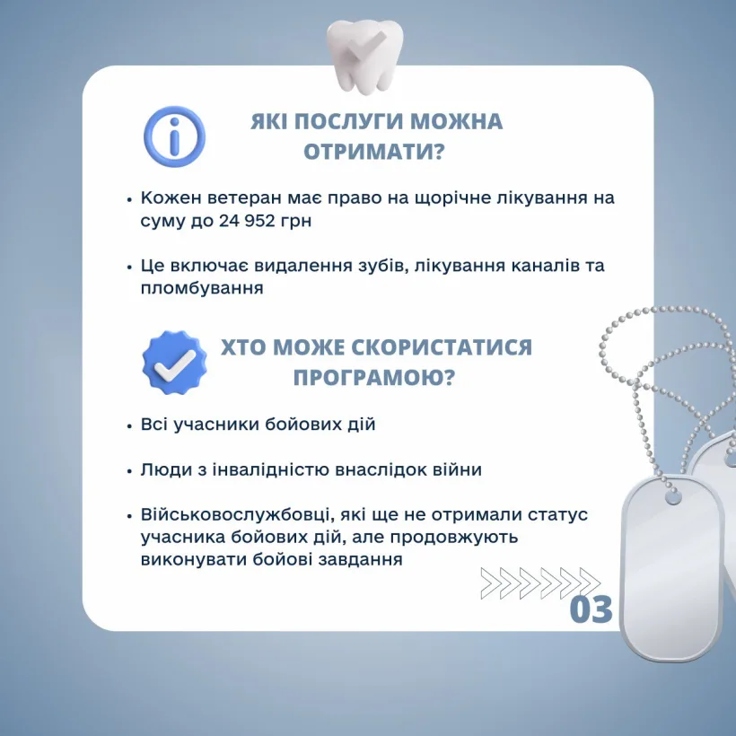Законодавство України передбачає низку пільг та гарантій для учасників бойових дій, зокрема у сфері медичного обслуговування. Відповідно до чинних нормативно-правових актів, окремі категорії осіб мають право на безоплатне або пільгове зубопротезування: