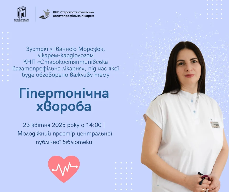 Шановні громадяни! Запрошуємо на інформаційну зустріч з Іванною Морозюк, лікарем-кардіологом КНП «Старокостянтинівська багатопрофільна лікарня», на тему: "Гіпертонічна хвороба", в рамках...
