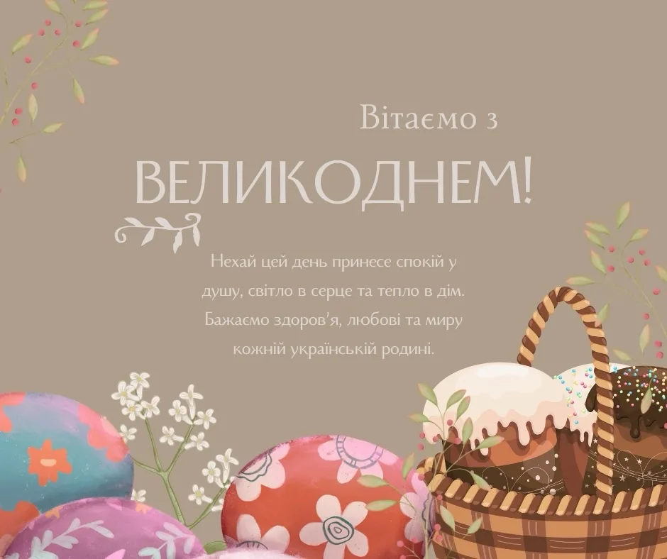 Вітаємо з Великоднем! Нехай це світле свято Воскресіння Христового принесе у Ваш дім радість, мир та благополуччя. Христос Воскрес!🕊️